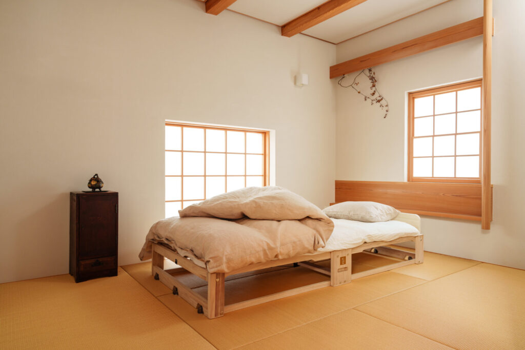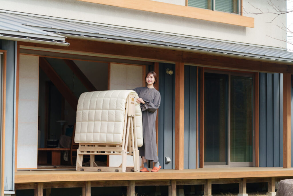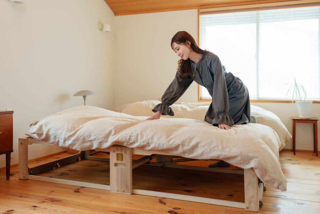 桐材は自ら湿度を調整してくれますが、マットレスや布団の下に常に湿気がこもった状態が続くと、その機能も最大限に発揮されません。そこで、月に一度を目安にマットレスや布団を上げて、すのこ部分に風を通す時間を作ってあげることが重要です。