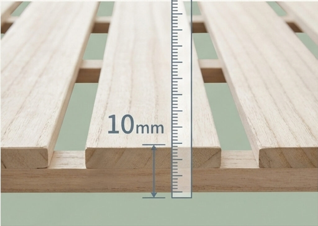 すのこ板が薄すぎると、一点に加重がかかった際に割れやすくなるため注意が必要です。一般的には、厚みが10mm(1cm)以上あるすのこ板が使われている製品を選ぶと、長期的な安心感が増します。